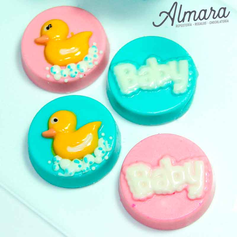 -Figura en chocolate de pato y palabra "Baby".