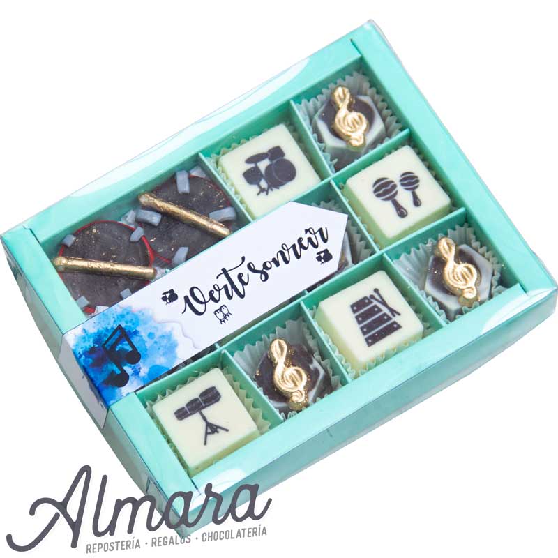 • 5 Bombones estampados con instrumentos de percusión rellenos de almendras de café