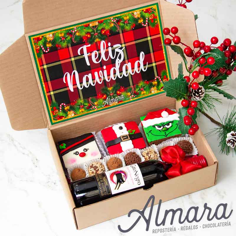 • 1 Caja cartón 26,5 por 18 y 7cm de alto, adhesivo con mensaje según la temática y lazo de tela.