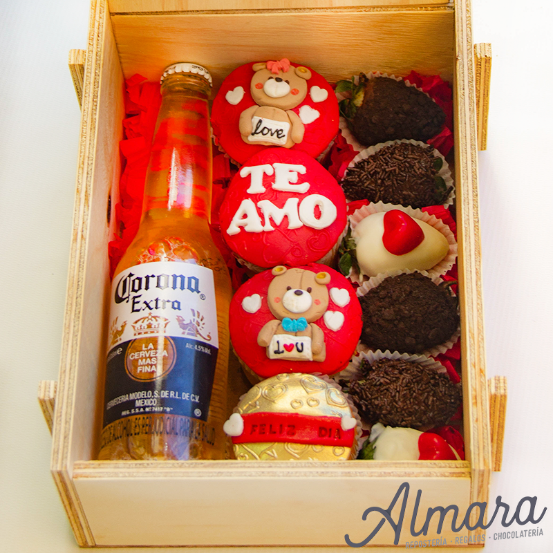 • Empaque en caja de madera 26 por 20 por 10cm decoración con cinta y moño de papel en la parte externa.